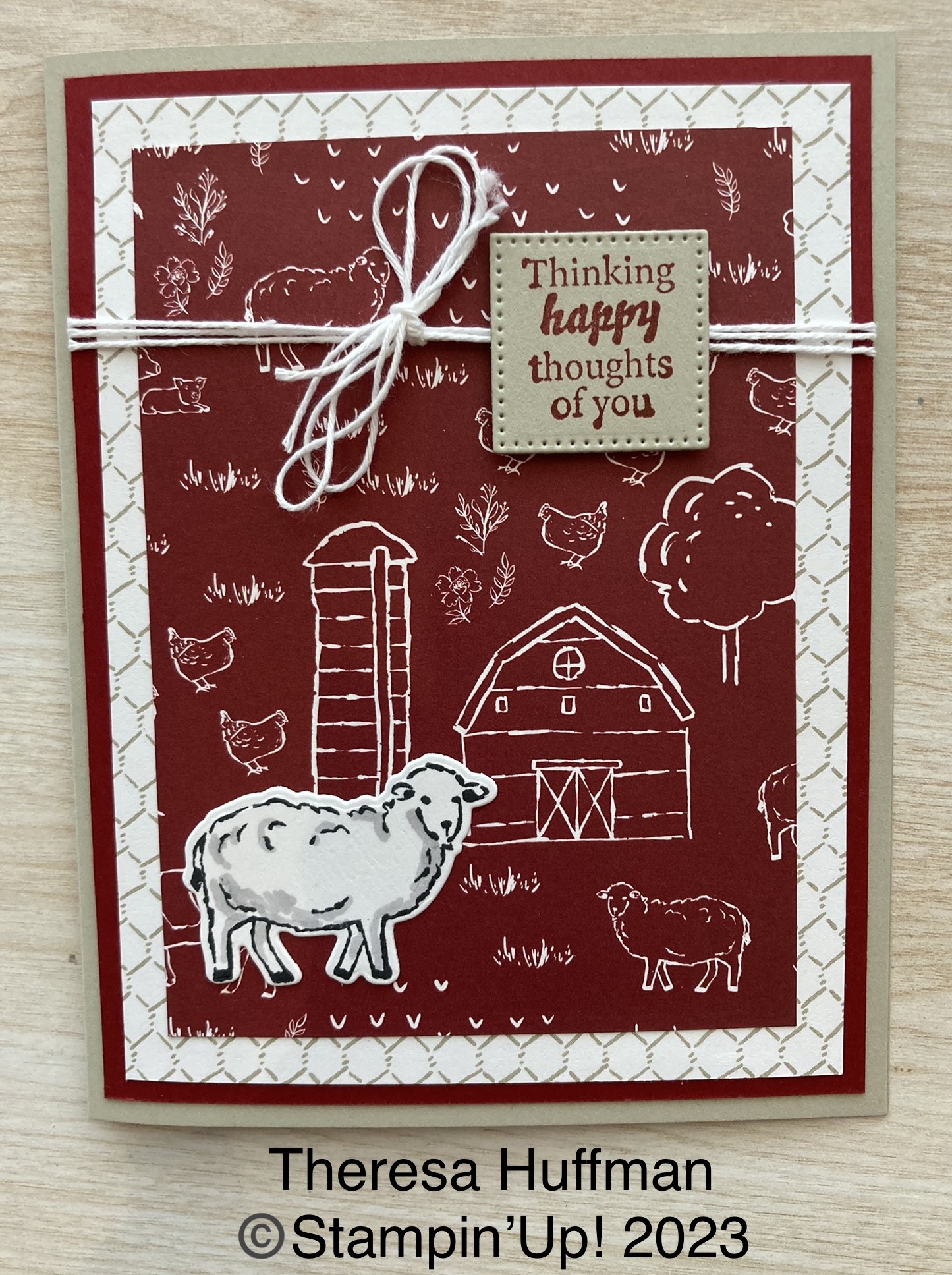 I used Cherry Cobble ink as well as the smallest square from the Stylish Shapes dies. I stamped the sheep image on Basic White card stock and colored it with the Smoky Slate Stampin’ Blend marker. I completed the project with White Baker’s Twine.